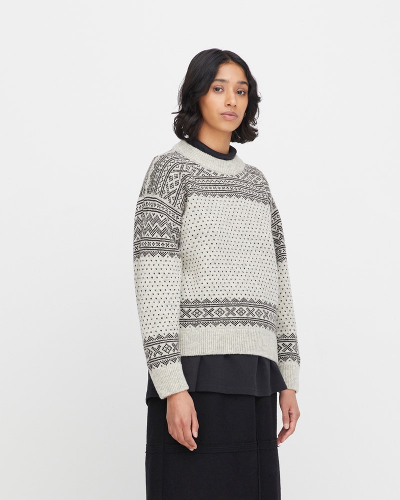 3000 NOKSetesdalsgenser til dame i norsk ull med tradisjonelt lusemønster. Velg mellom en stilren grå med sorte lus eller okergul med hvite lus, i størrelsene XS-XL.