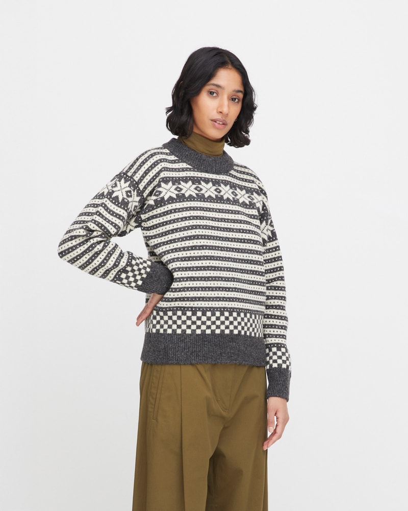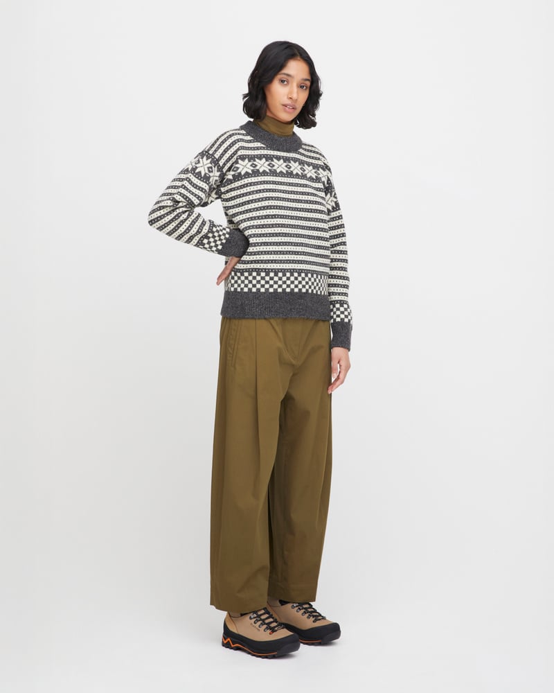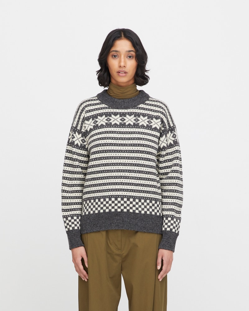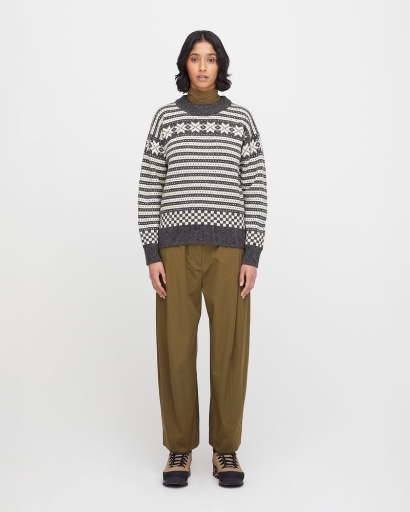 Genseren er strikket i norsk ull, som gir naturlig varme, god holdbarhet og fukttransport – perfekt for et norsk klima. Passformen er klassisk og feminin, med rund hals og et tidløst uttrykk som passer både til jeans og turklær.