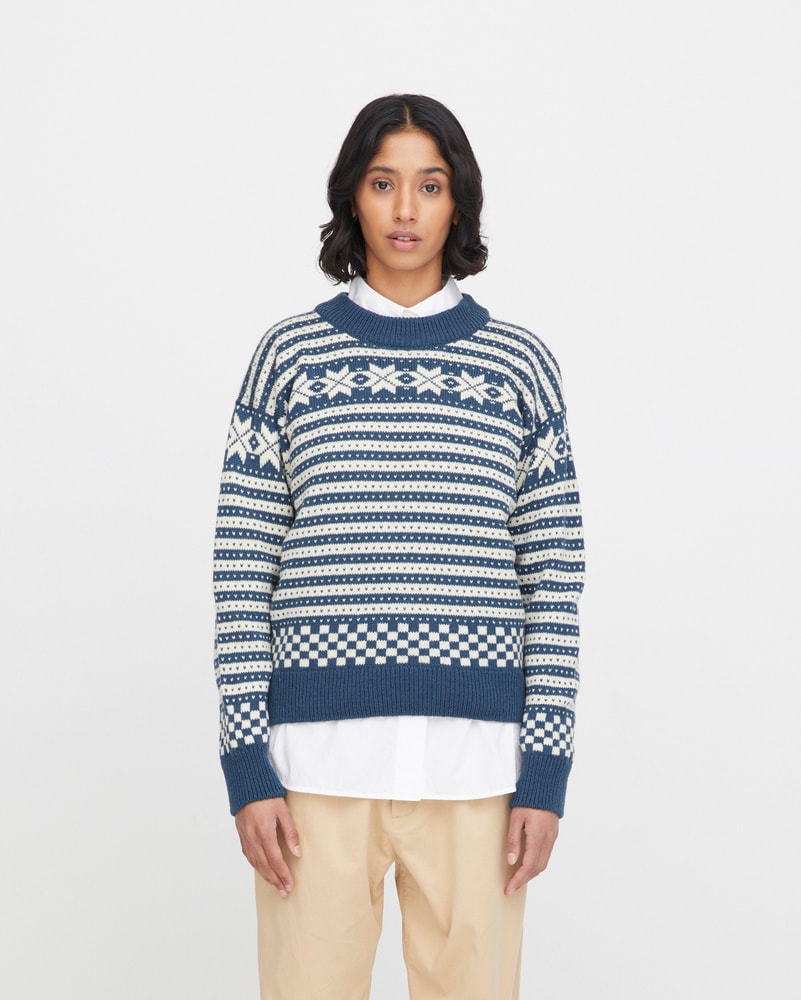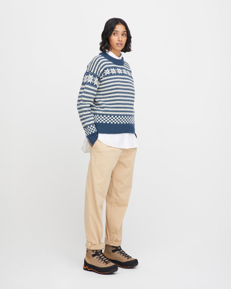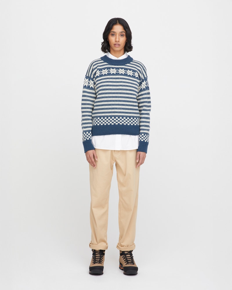 Genseren er strikket i norsk ull, som gir naturlig varme, god holdbarhet og fukttransport – perfekt for et norsk klima. Passformen er klassisk og feminin, med rund hals og et tidløst uttrykk som passer både til jeans og turklær.