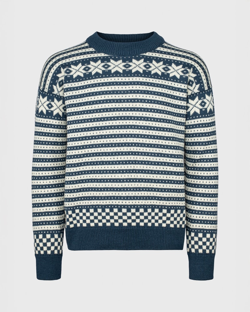 Fana til herre er en tidløs klassiker med dype røtter i vestlandske strikketradisjoner. Den er strikket i norsk ull, kjent for naturlig varme, slitestyrke og evnen til å regulere temperatur i all slags vær. Med sitt karakteristiske rutemønster og border har Fana blitt et av Norges mest gjenkjennelige mønstre.