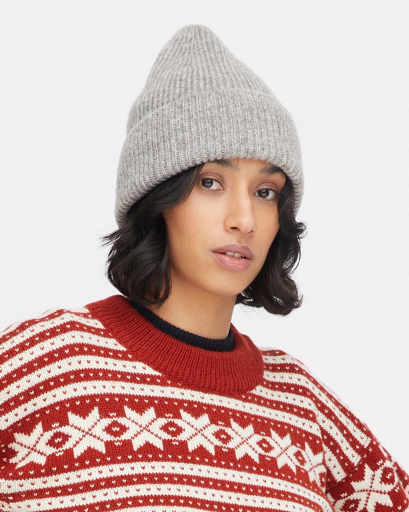 Velg mellom seks tidløse og allsidige farger: koksgrå, grå, lys grå, blå melert, skogsgrønn og rustrød. Luen er strikket i enkel ribb.
